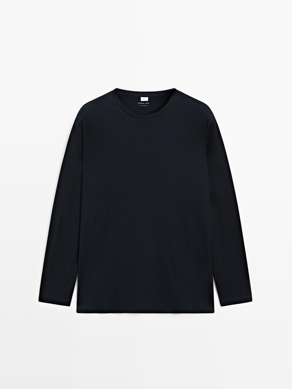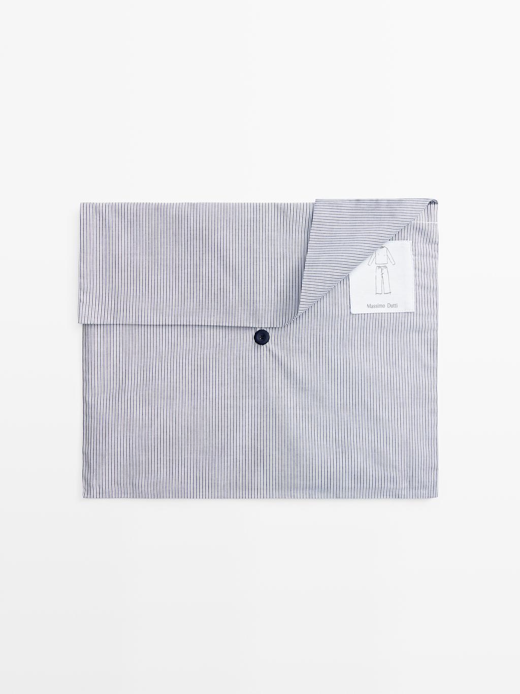 Two-piece pyjamas made from 100% cotton. Long-sleeved T-shirt with a round neck and trousers with an adjustable drawstring waist, two side pockets and a patch pocket on the back. Striped detail.