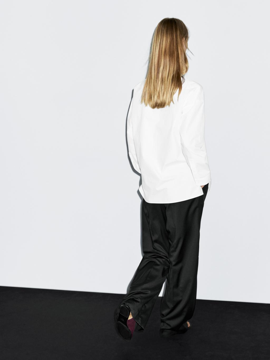 Crossover blouse made of 100% cotton . Long sleeves with buttoned cuffs. V-neck . Hidden button closure. Side vents at the hem. Wide and relaxed silhouette, not tailored.