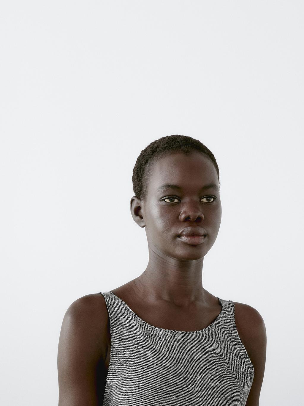 Midi dress made of 100% linen fabric . Halter neck. Crew neck. Sleeveless. Lined. Frayed seam detail. Textured.