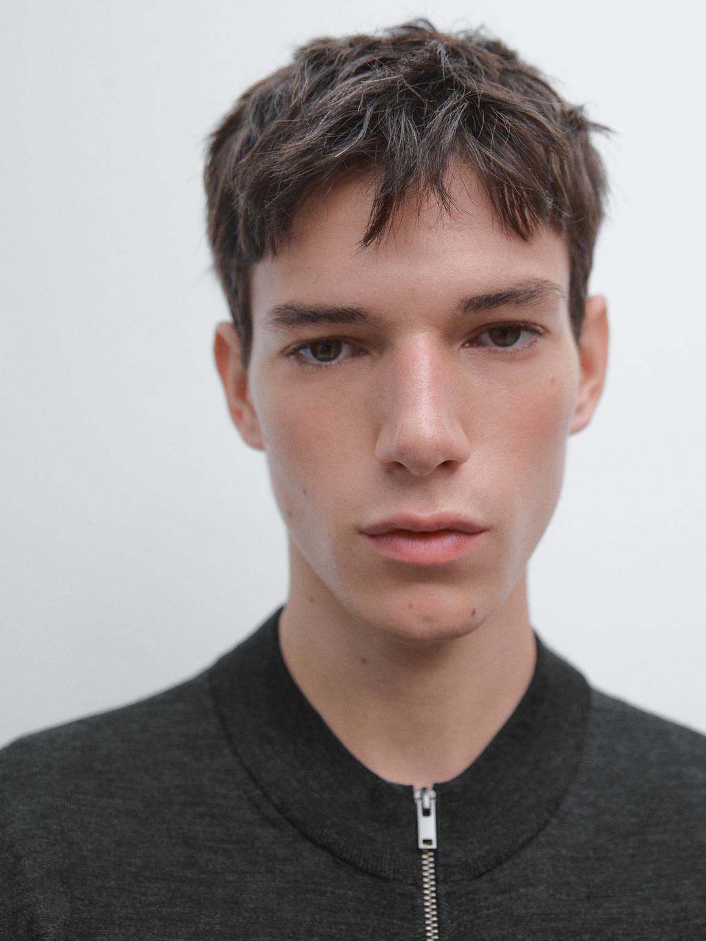 Cardigan made of 100% wool fabric. It has a two-way zip fastening. High collar. Two side pockets. Ribbed trims .