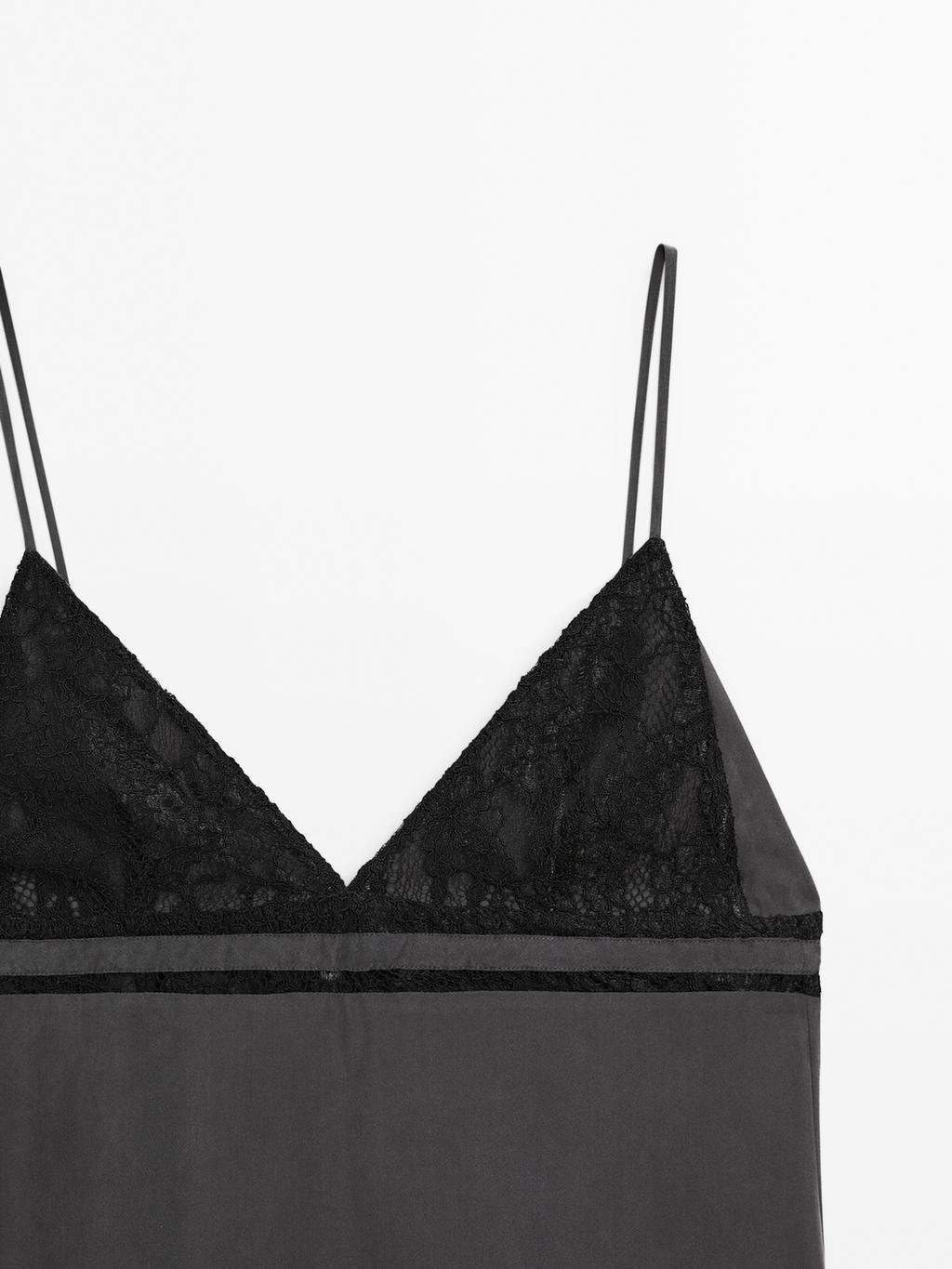 Midi dress made of 100% silk fabric. V-neck . Adjustable straps. Lace detail.