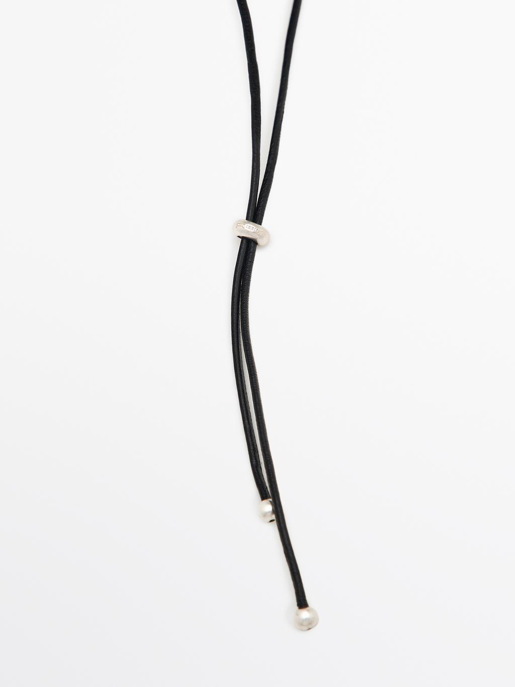 Leather cord necklace with metal end . Abstract metal piece. Drawstring closure.
