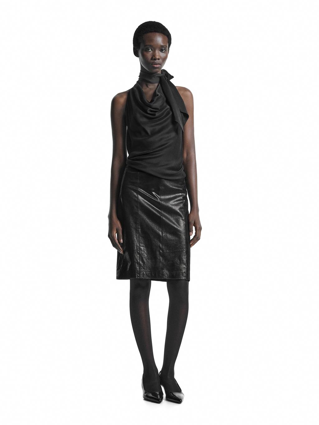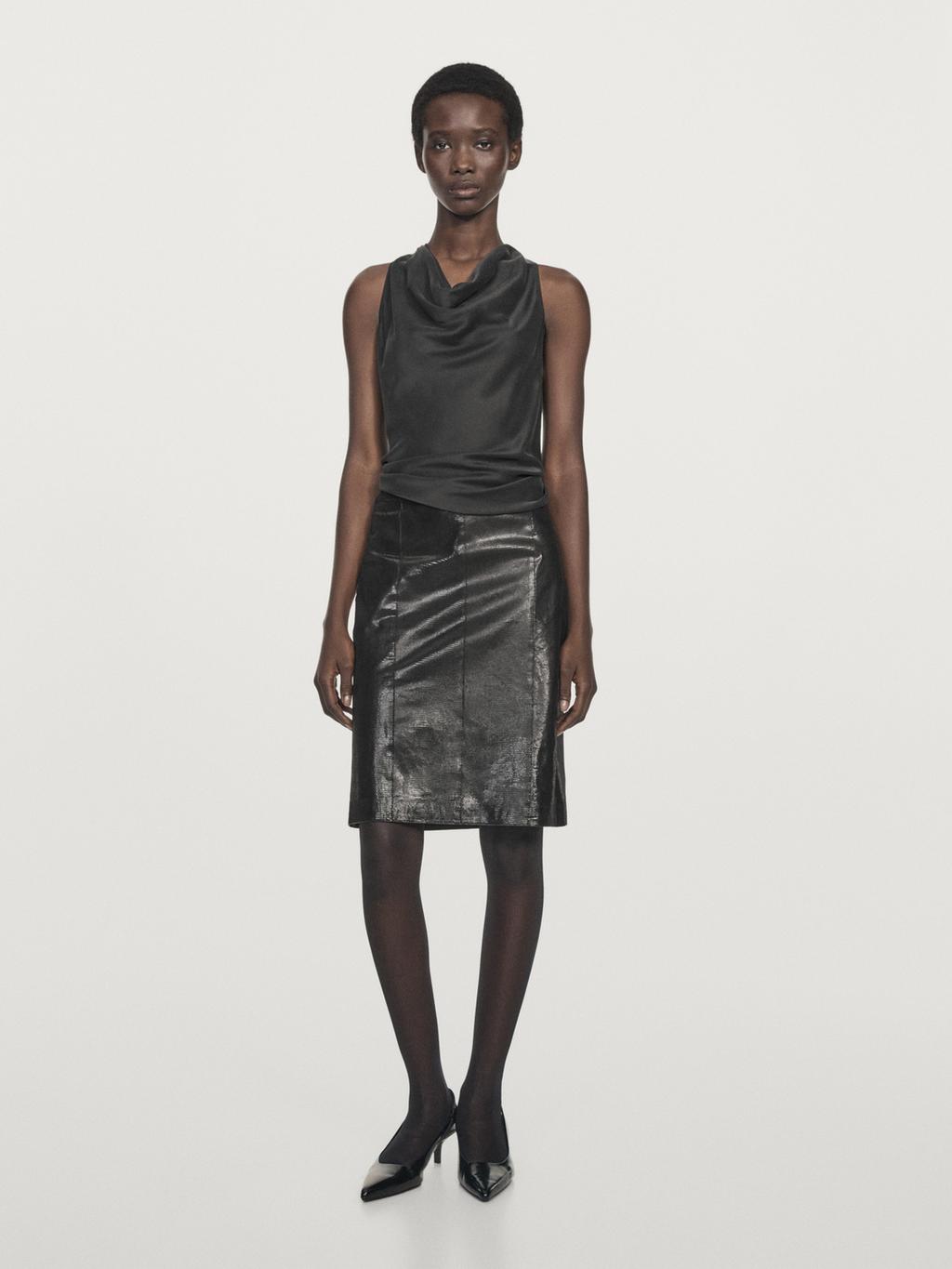 Short skirt made of goatskin leather . Zip fastening at the back. Snakeskin print finish. Lined.