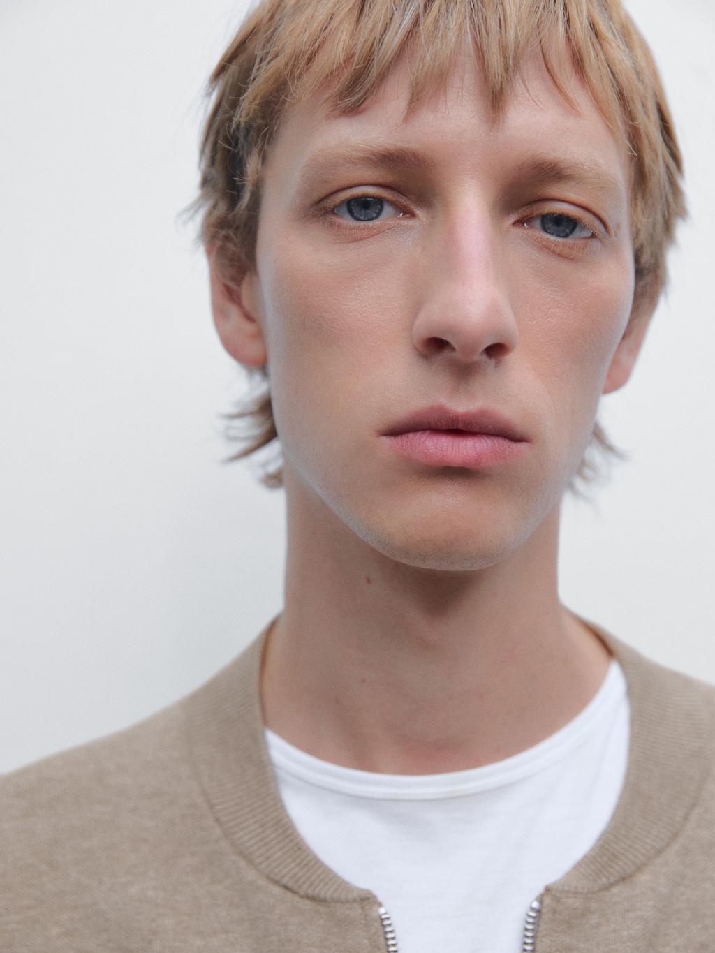Bomber-style cardigan made of knit fabric . Stand-up collar. It has a two-way zip fastening. Ribbed trims .