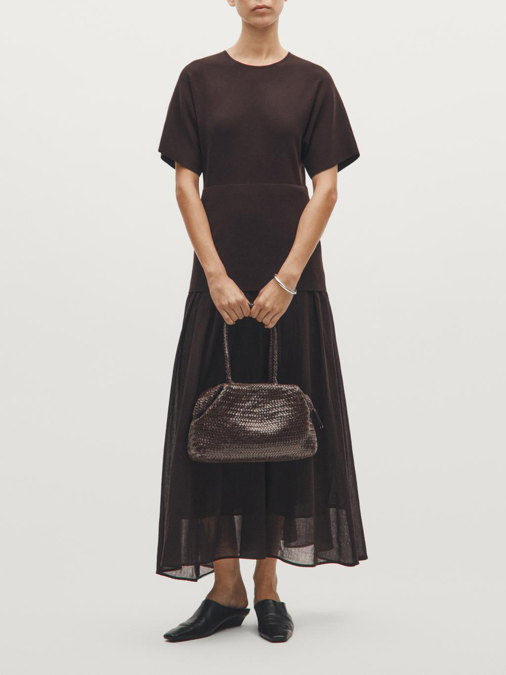 Handbag made of cowhide leather with a nappa finish. A handle/shoulder strap. Zip fastening. Cotton lining. Braided detail.