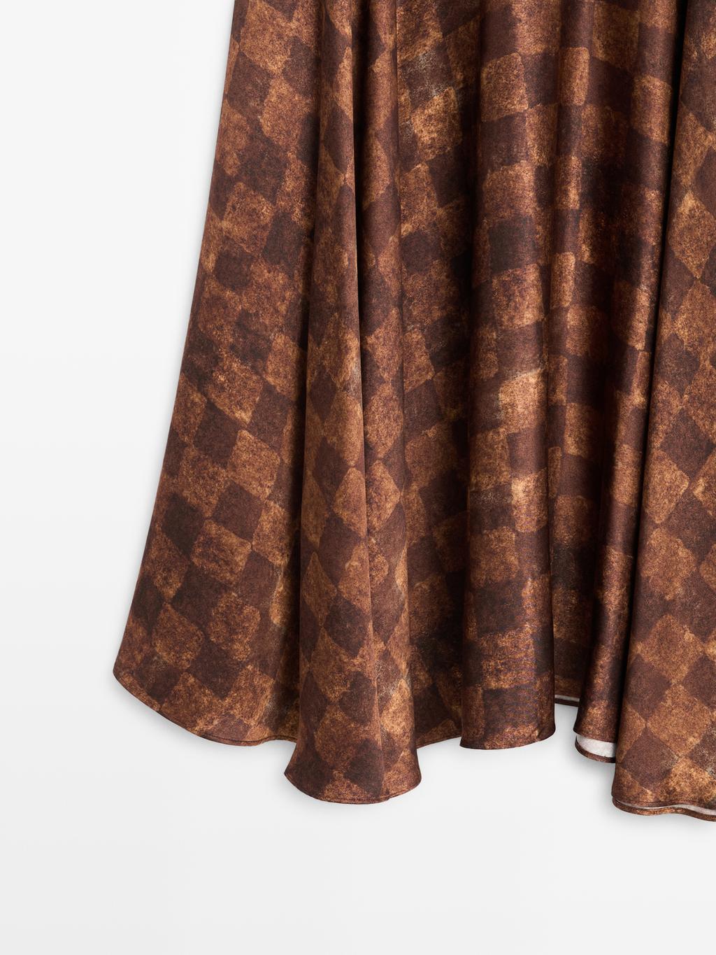 Flared midi skirt. Fitted corset belt detail at the waist. Side zip fastening. Check print. Flowing fabric with a satin finish.