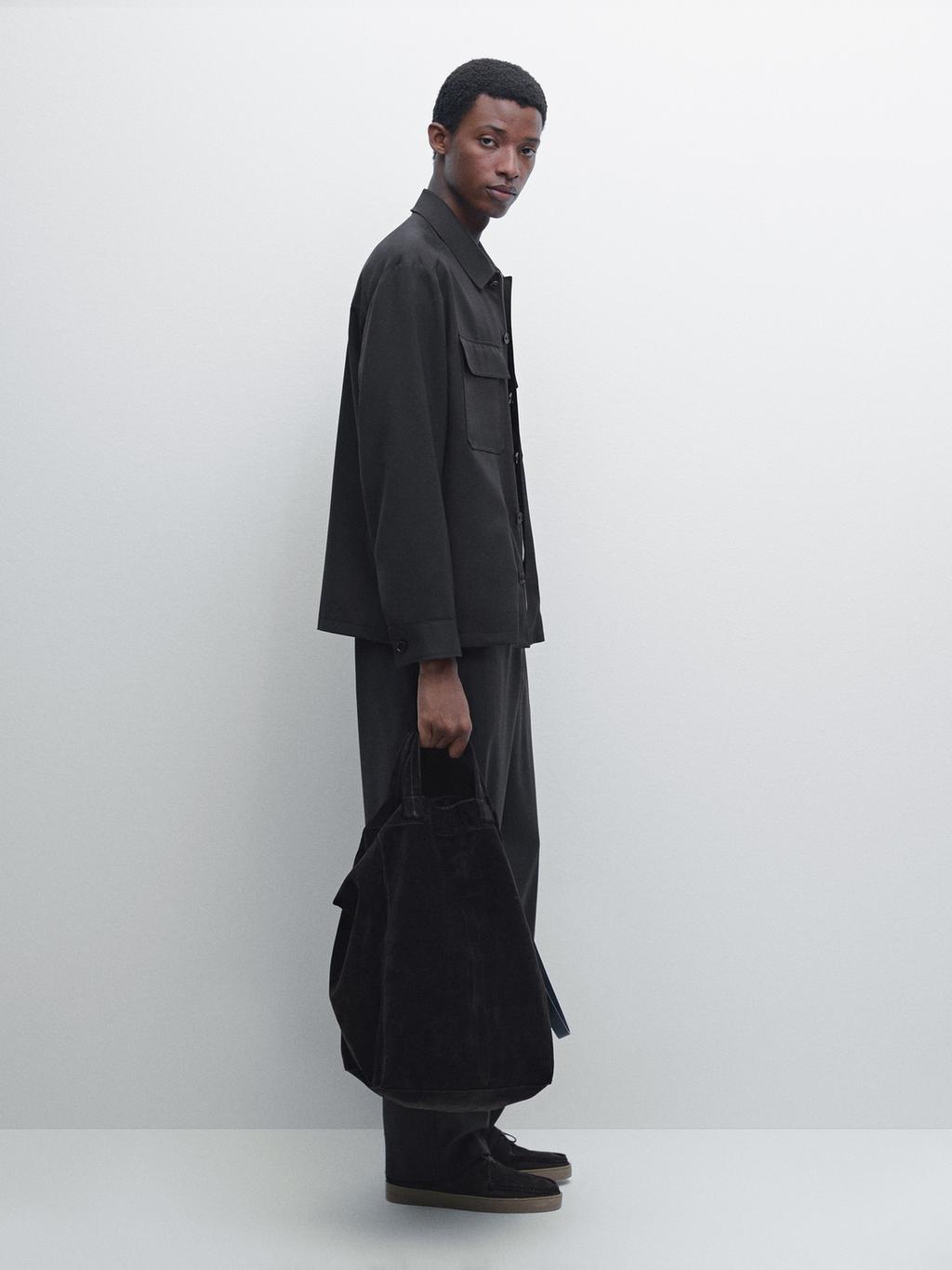 Overshirt made from wool fabric. Long sleeves with buttoned cuffs. Shirt collar. Concealed zip closure with buttoned placket. Two side pockets. Two flap pockets. An inside pocket. Lined.