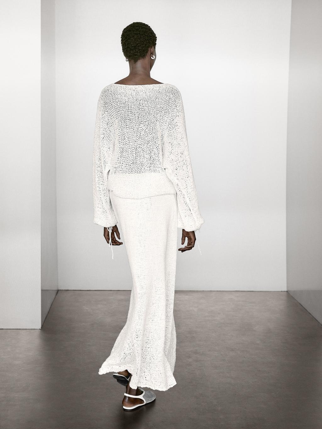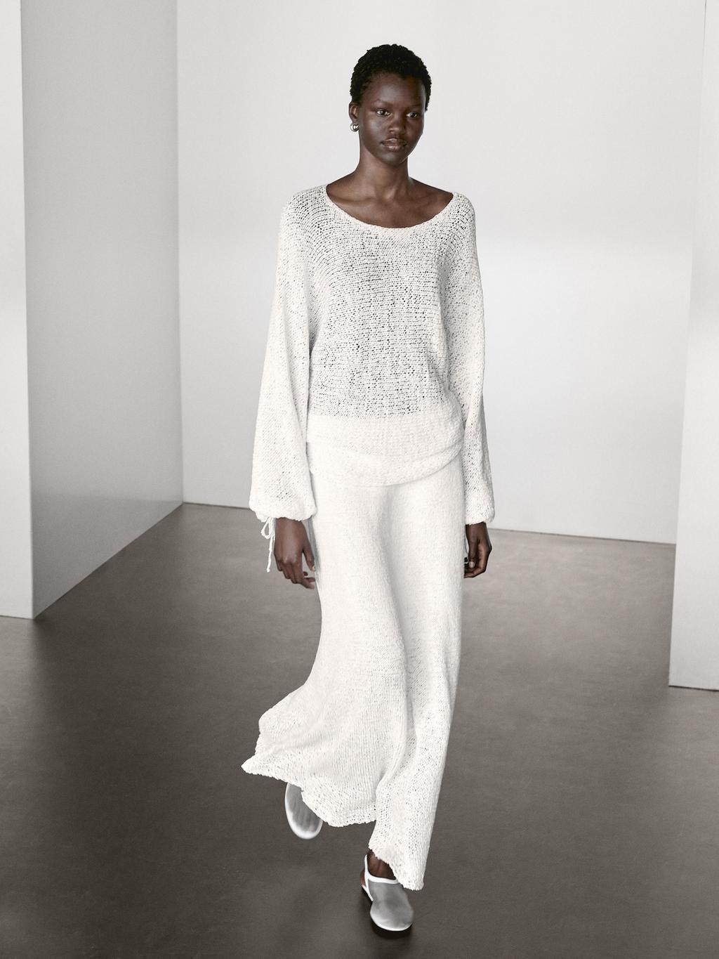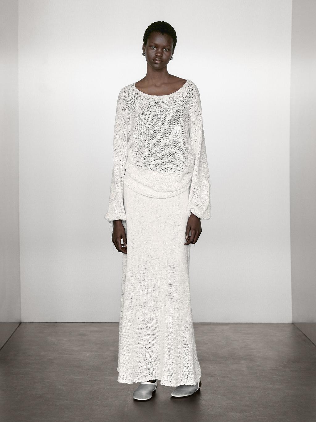 Knit fabric midi skirt. Flared. Elasticated waistband detail. Matching garment available.