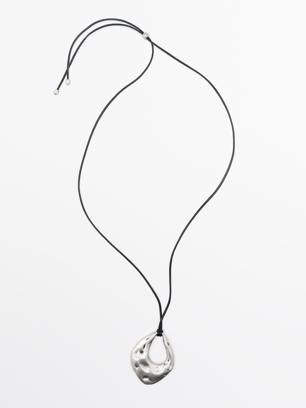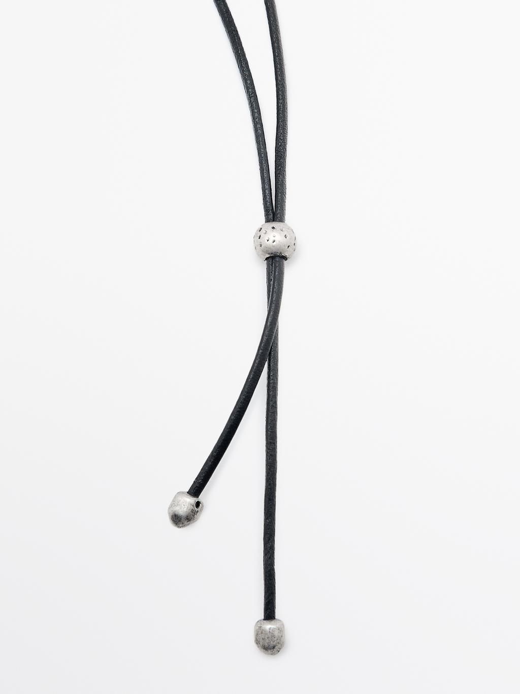 Adjustable necklace with sheepskin and brass cord and piece with an asymmetric shape. Detail: end with small metal part .