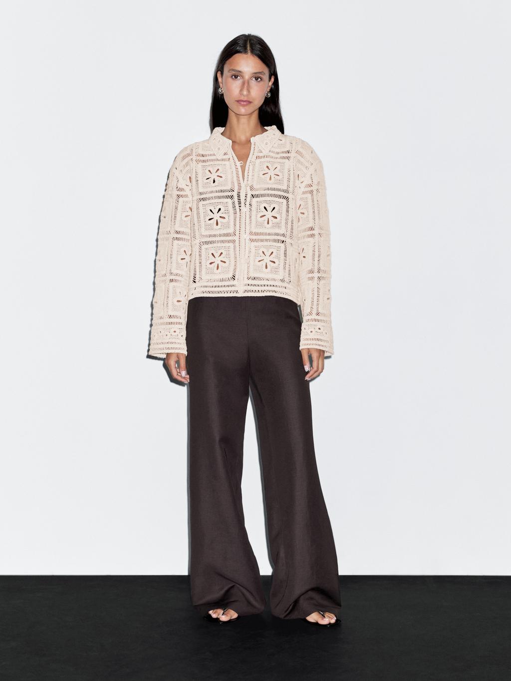 Jacket made of 100% cotton. Long sleeves. Button-up front. Polo Collar. Openwork fabric . Crochet fabric.