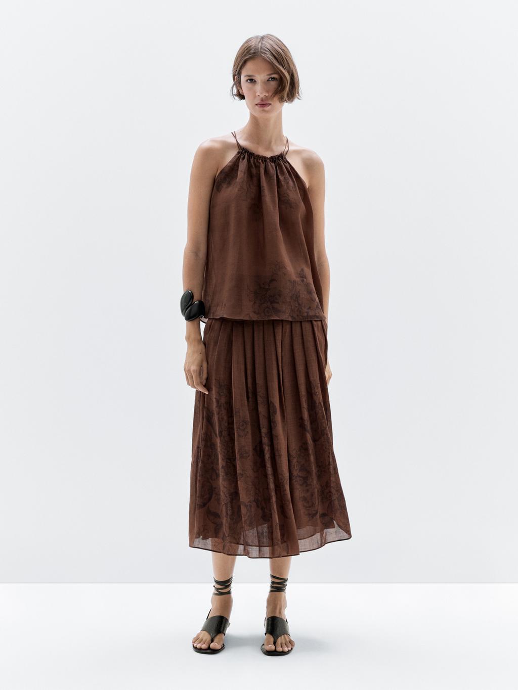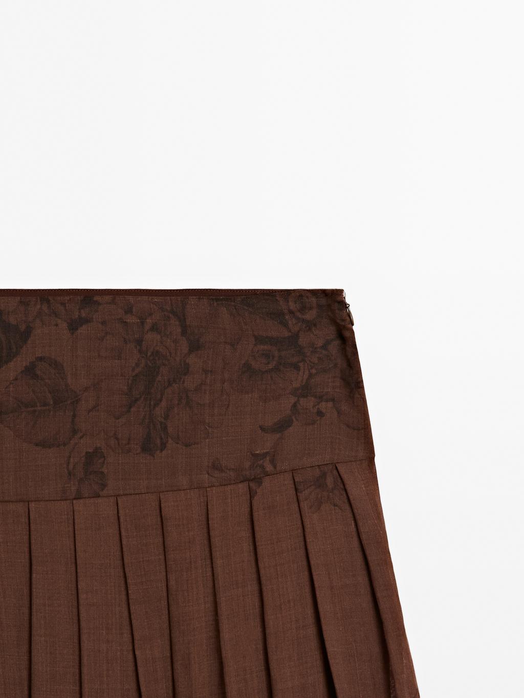 Midi skirt with box pleat detail . Side zip fastening. Skirt with yoke. Floral print detail .