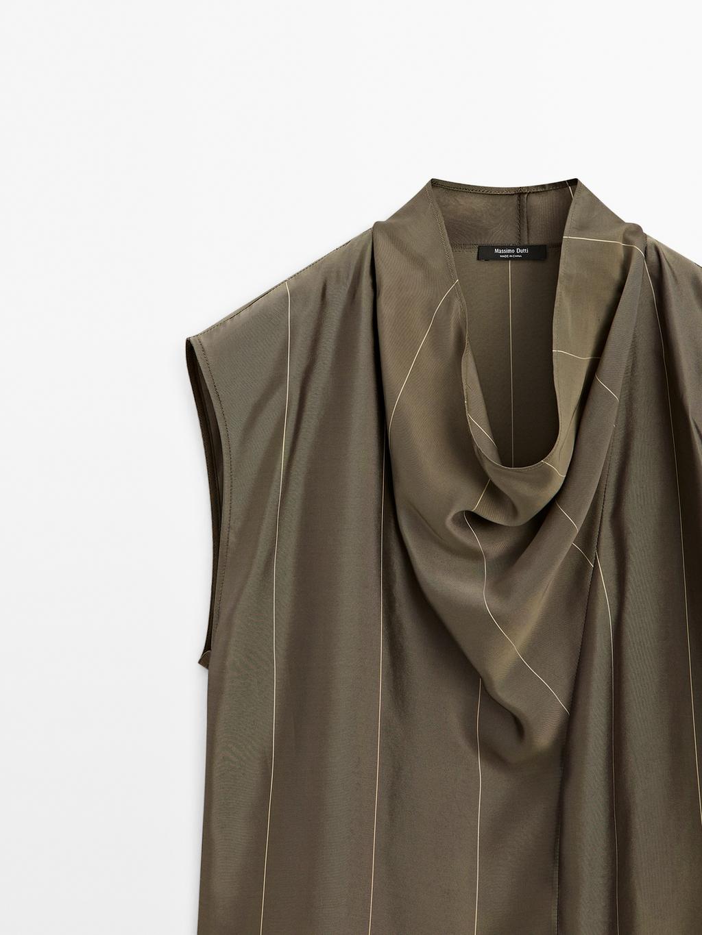Flowing blouse with satin finish fabric. Draped collar. Sleeveless. Striped print. Matching garment available.