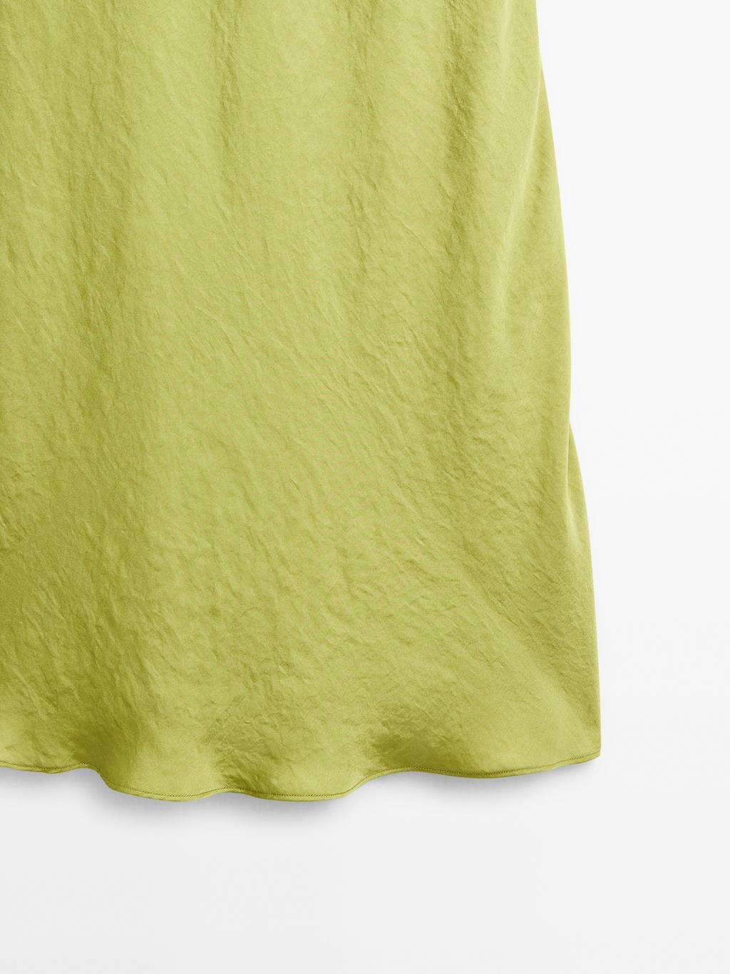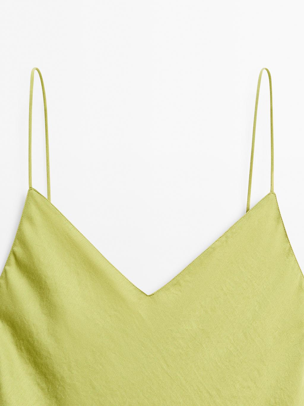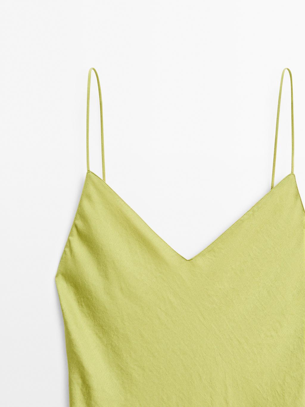 Lace-trimmed midi dress. Front V-neckline and low-cut back. Strappy. Flowing fabric with a satin finish.
