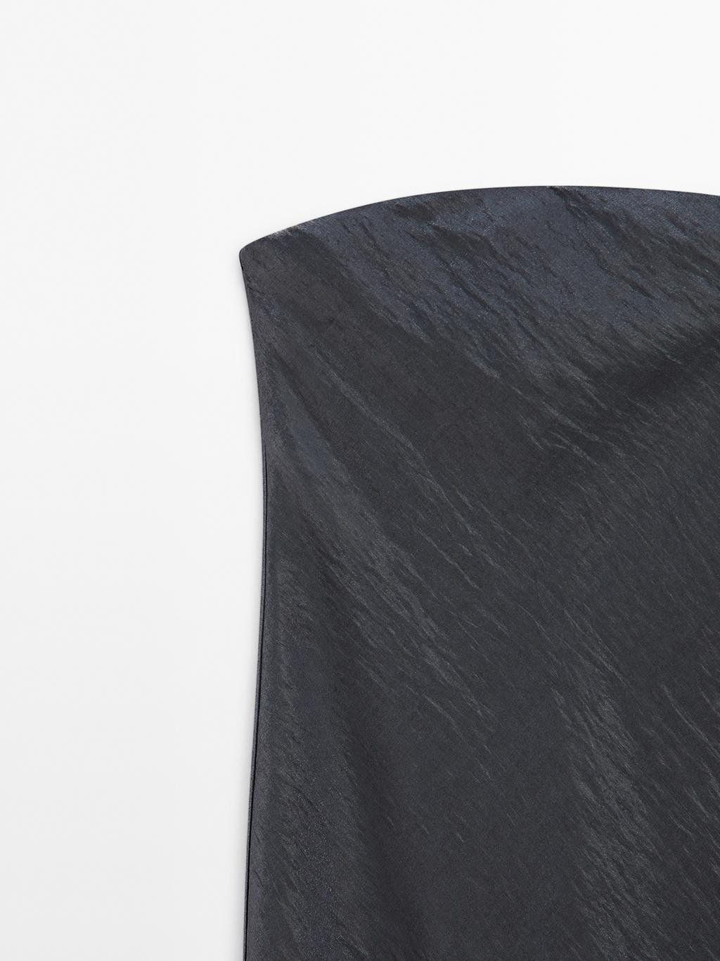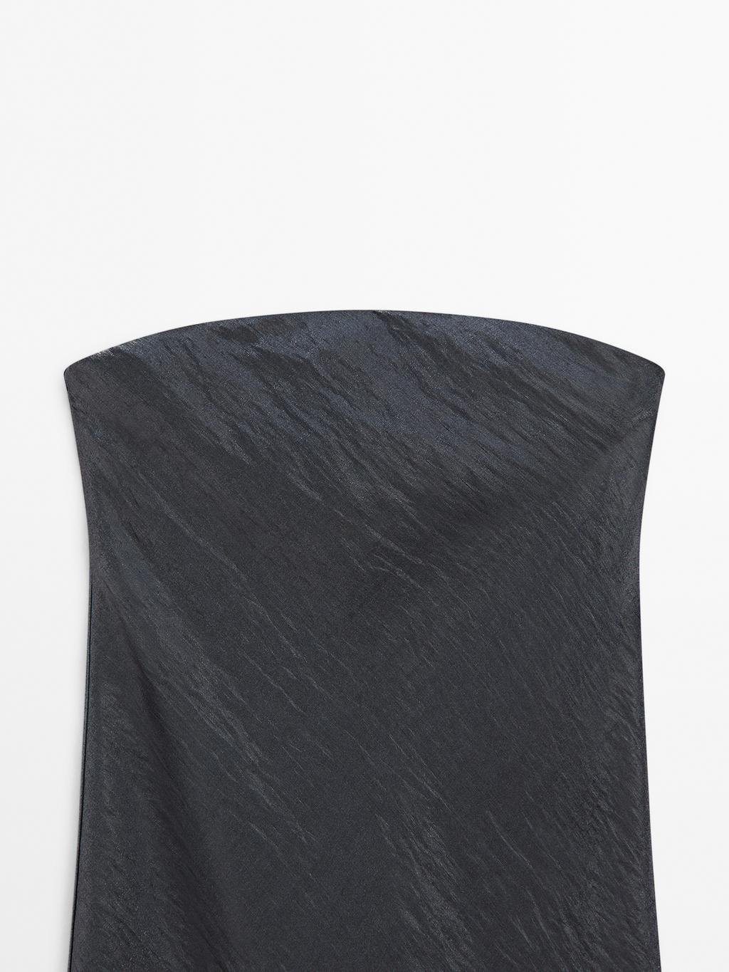 Midi dress made of linen blend fabric with a round neckline. Strapless neckline. Anti-slip tape around the chest circumference. Flowing fabric with a satin finish.