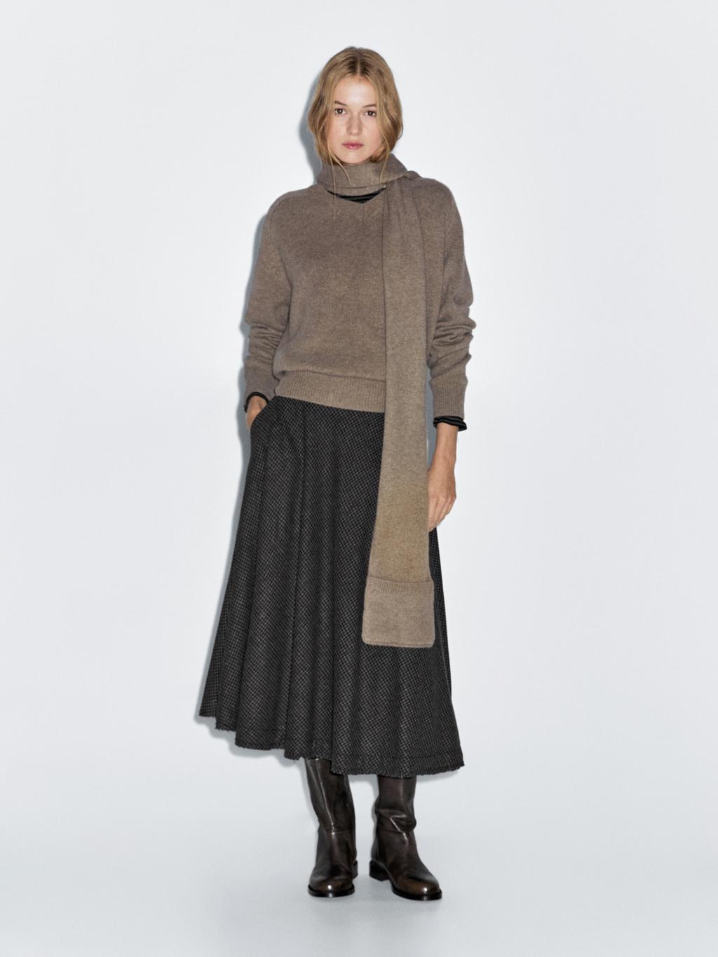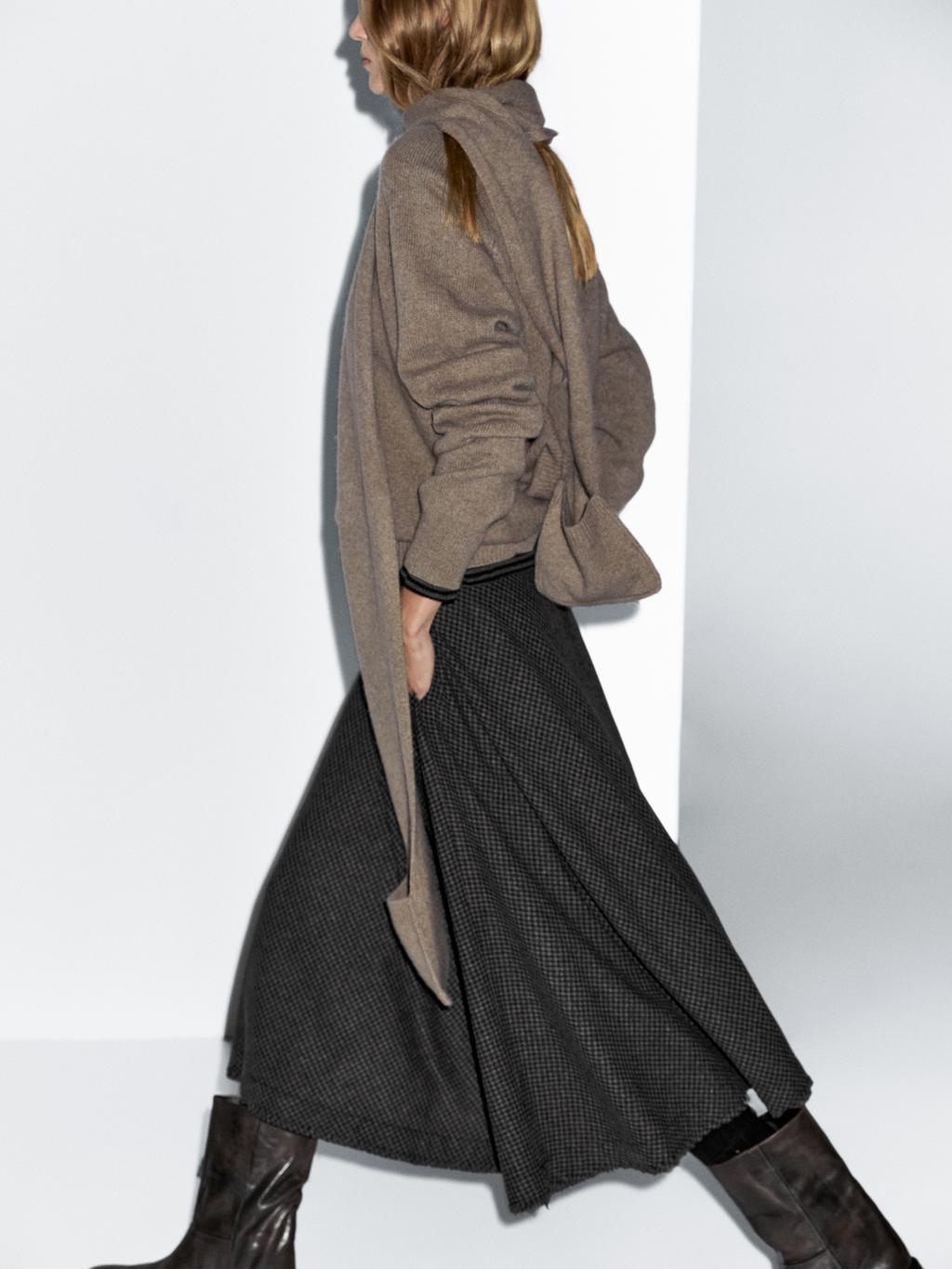 Midi skirt made of a wool blend fabric. Gingham. Side zip fastening. Two side pockets. Lined.