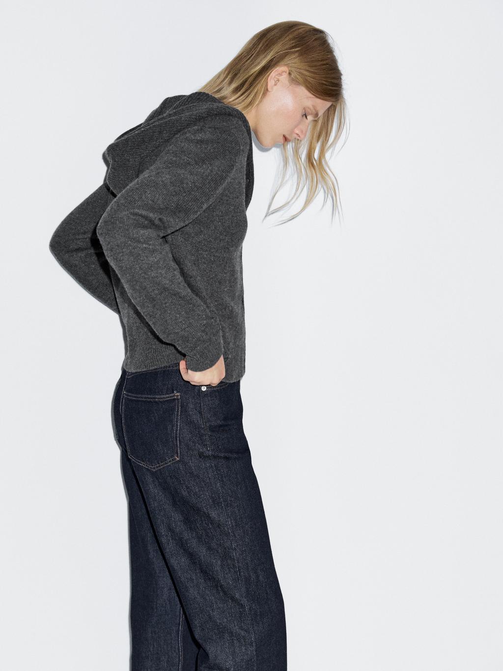 100% wool knit cardigan. Long sleeves. Button-up front. Hooded. Ribbed trims .