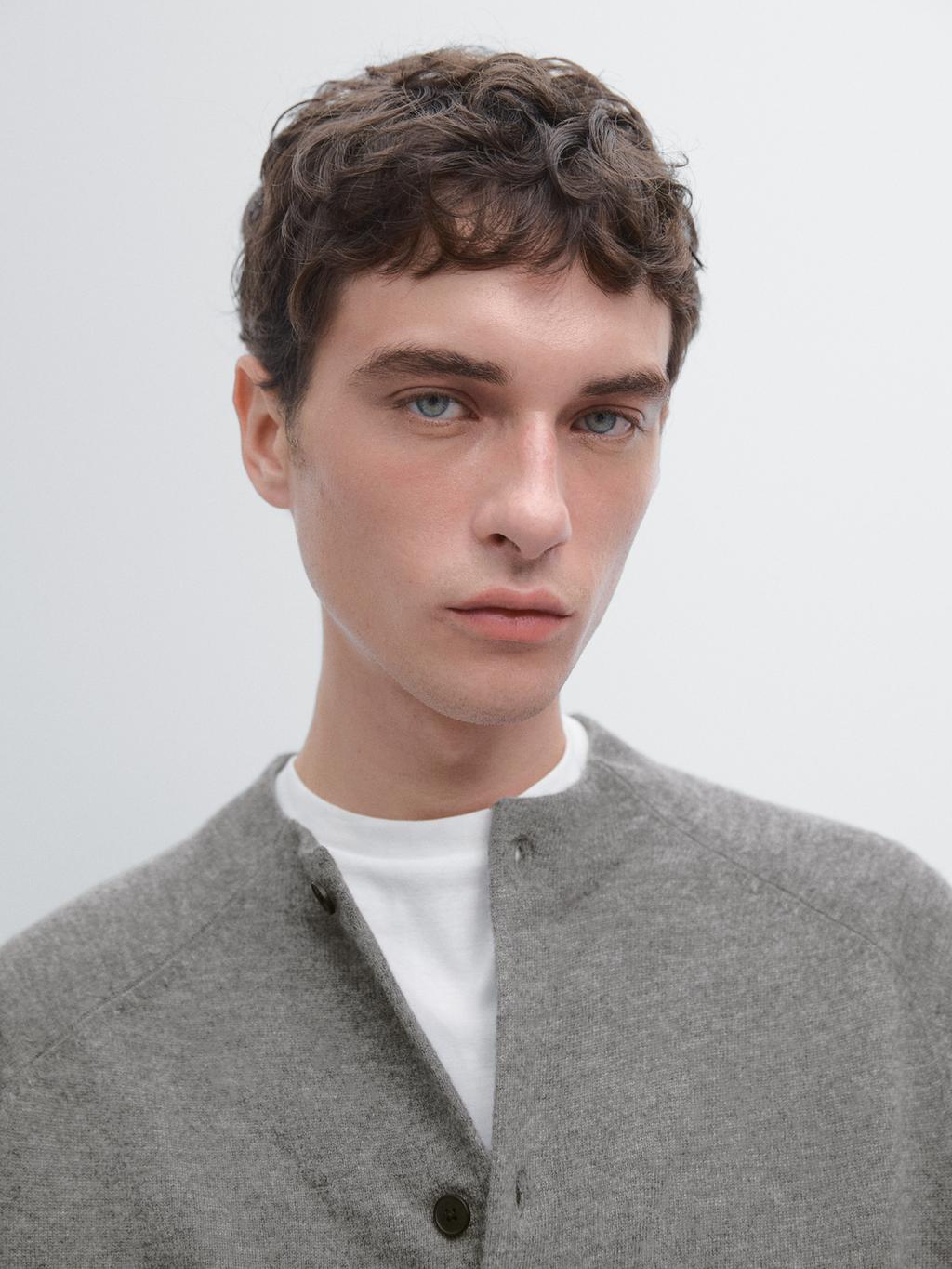 100% wool knit cardigan. Raglan sleeve. Button-up front. High collar. Ribbed trims .