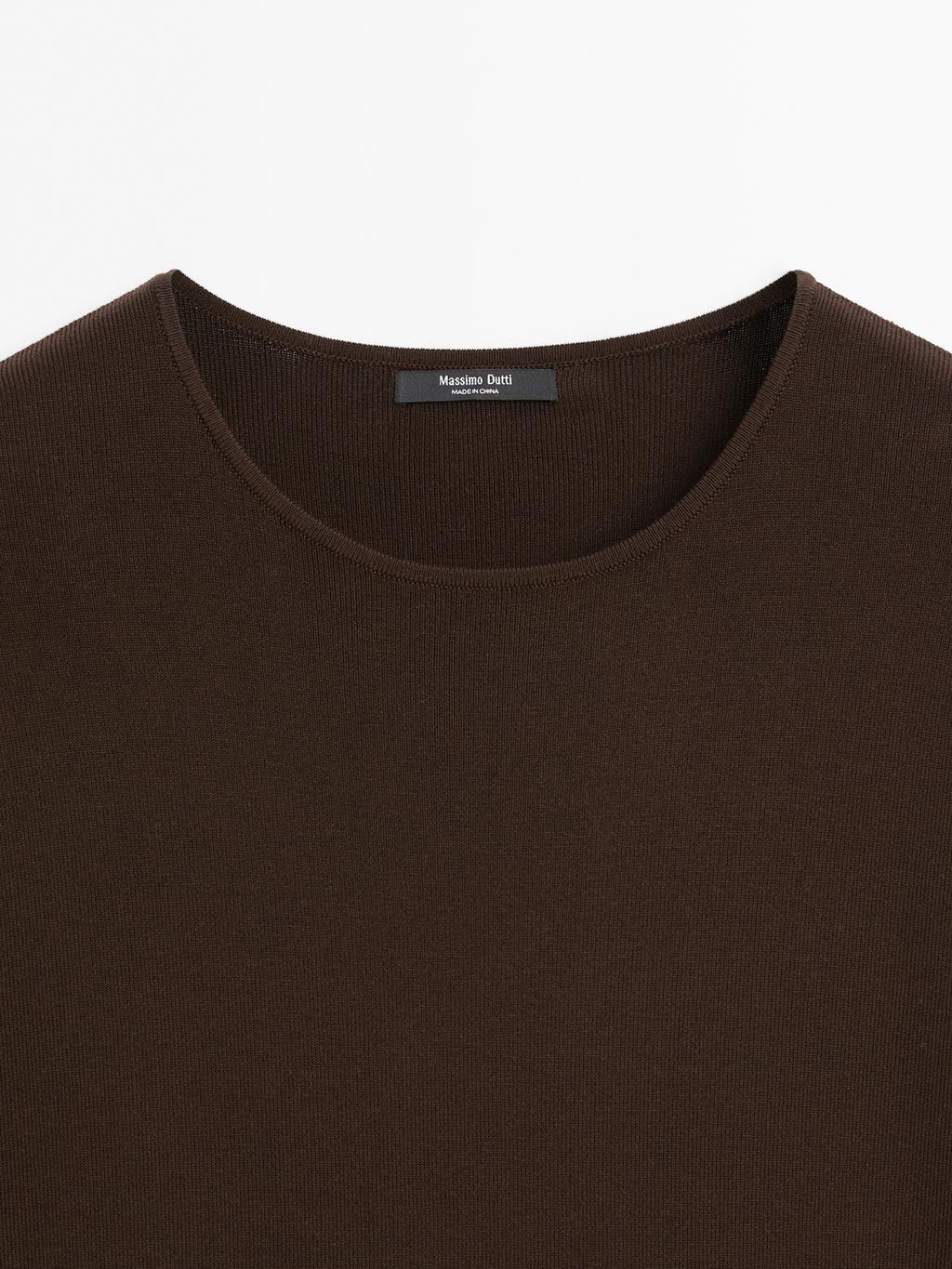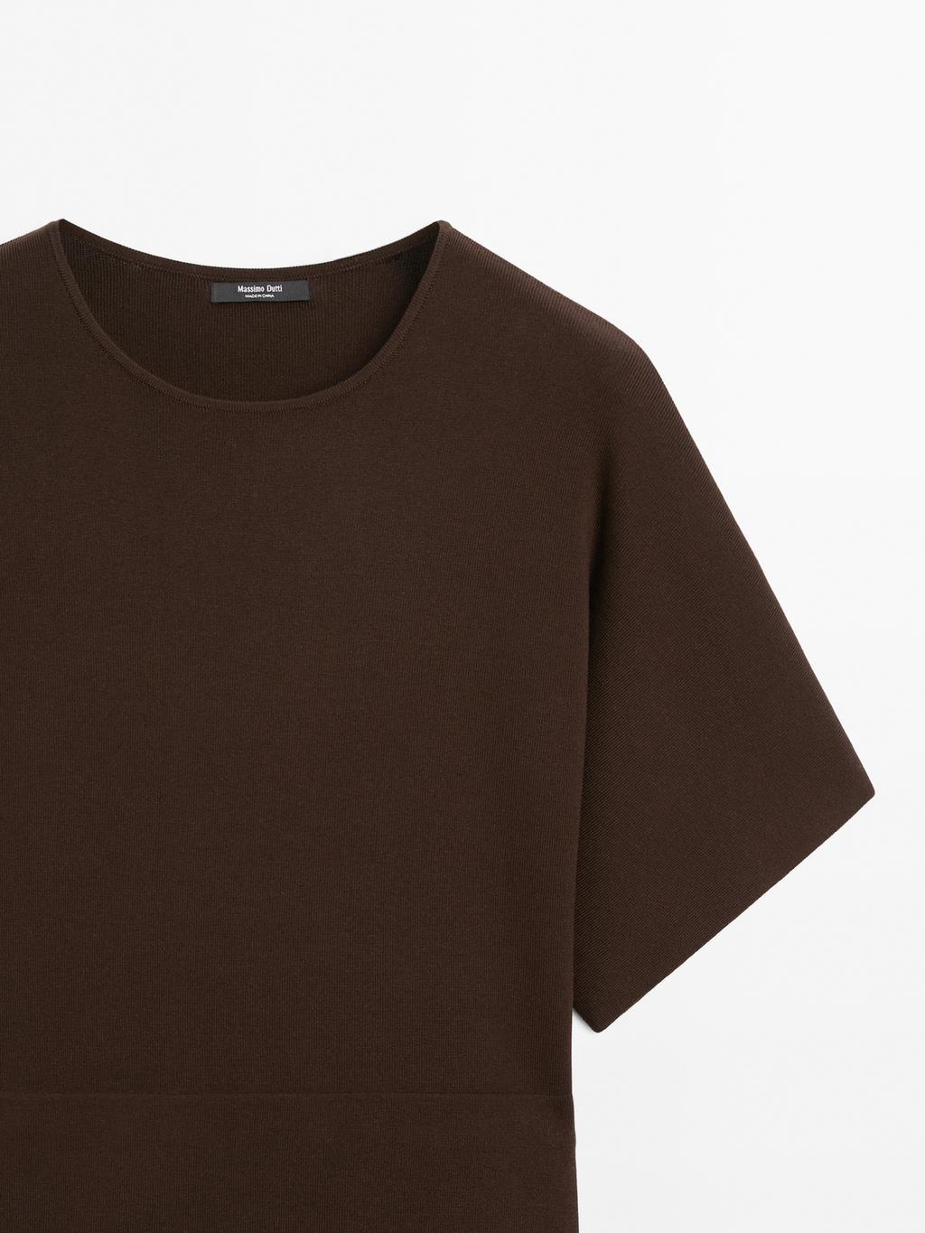 Combined long dress with a knit top part and gathered skirt. Short batwing sleeve. Crew neck.