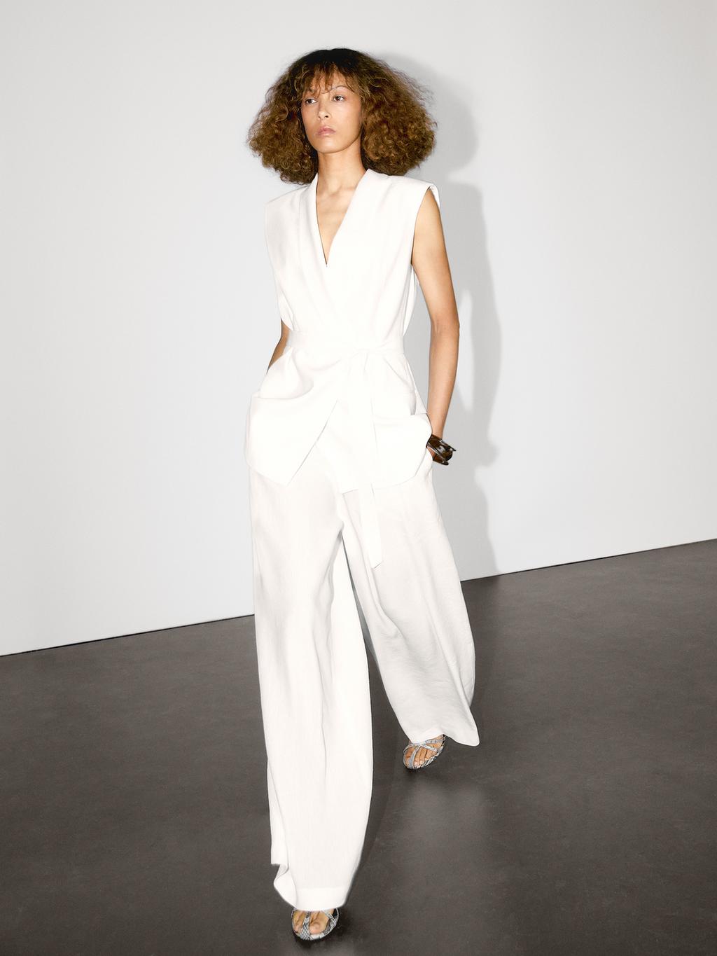 Waistcoat made of a linen blend fabric. Tuxedo collar. Sleeveless. Double-breasted button fastening at the front. Two jetted pockets. Lined. Matching garment available. Includes belt.