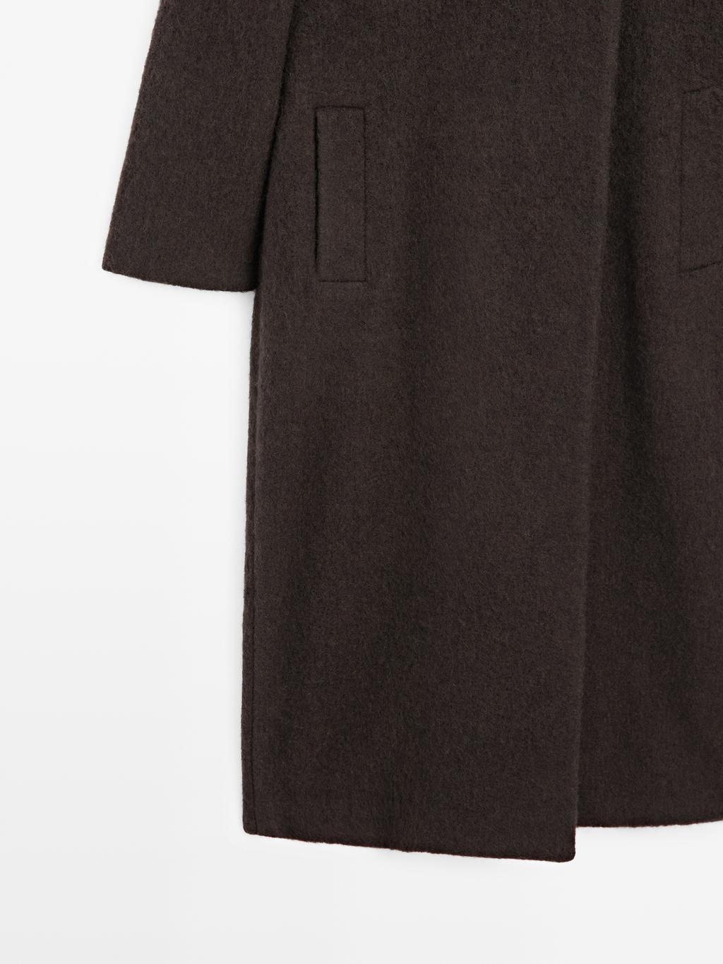 Long coat made of a wool blend fabric. High collar. Crossover fastening with one button and a concealed button . Two side pockets. Central back opening.
