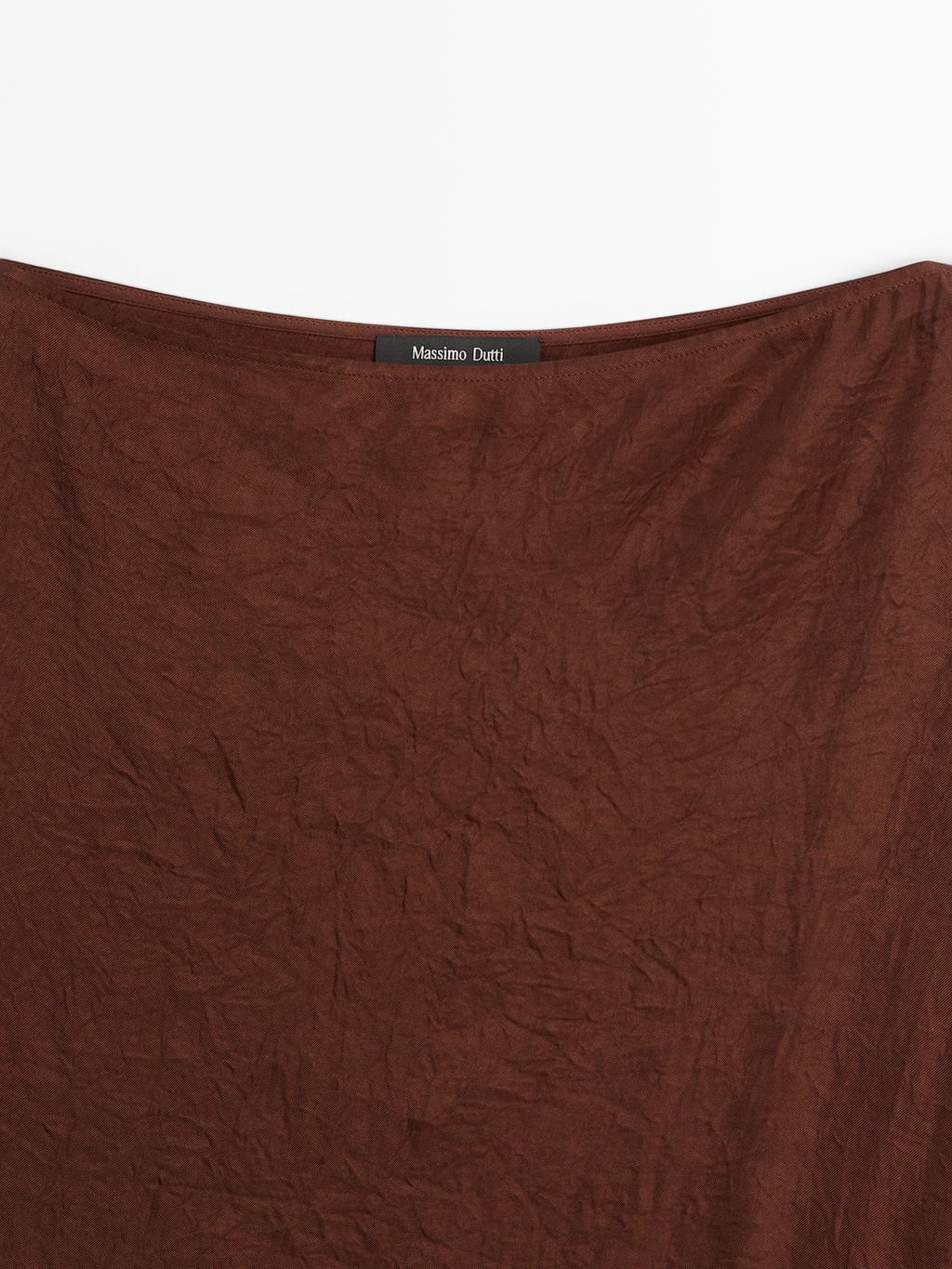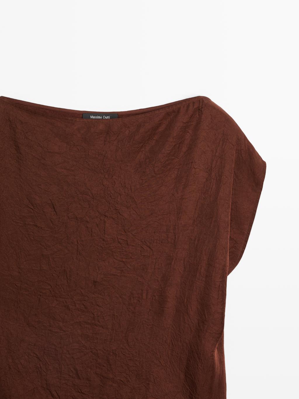 Long boat neck dress. Raglan sleeve. Gathered at the waist . Side zip & button fastening. Hem with back vent. Wrinkled effect finish.