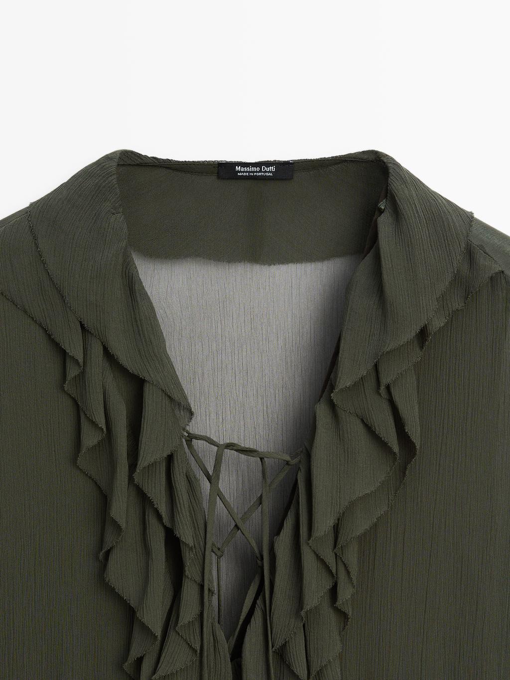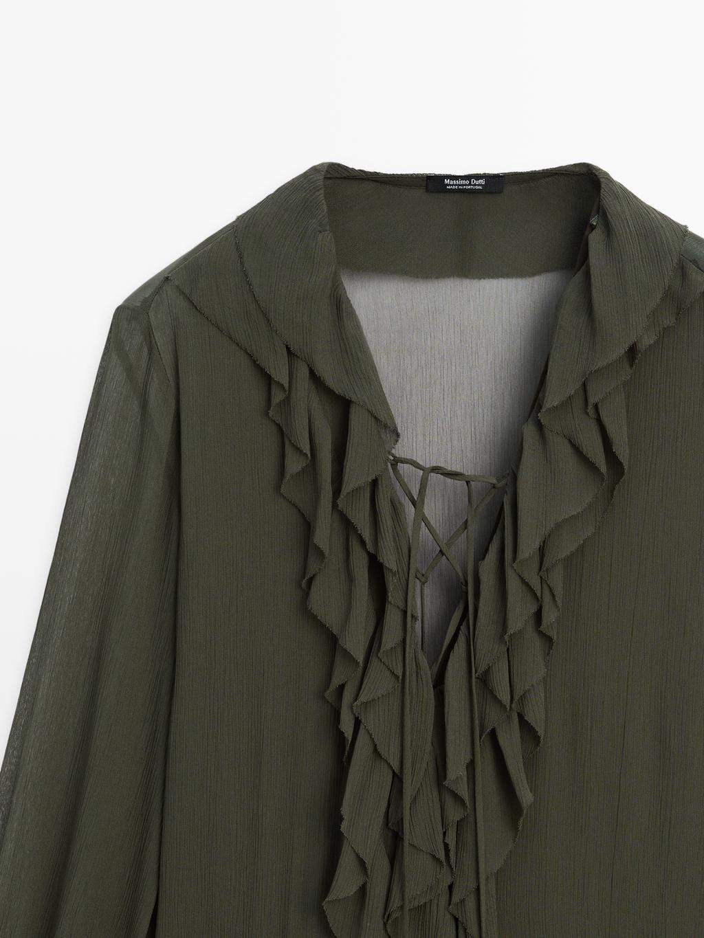 Long flowing dress. Long sleeves with buttoned cuffs. Adjustable drawstrings at the neck. V-neck with ruffle .