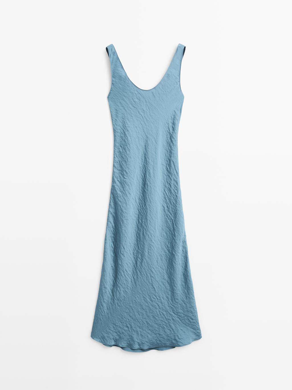 Long dress made of flowing fabric with a satin finish. Round front and back neckline. Straps.