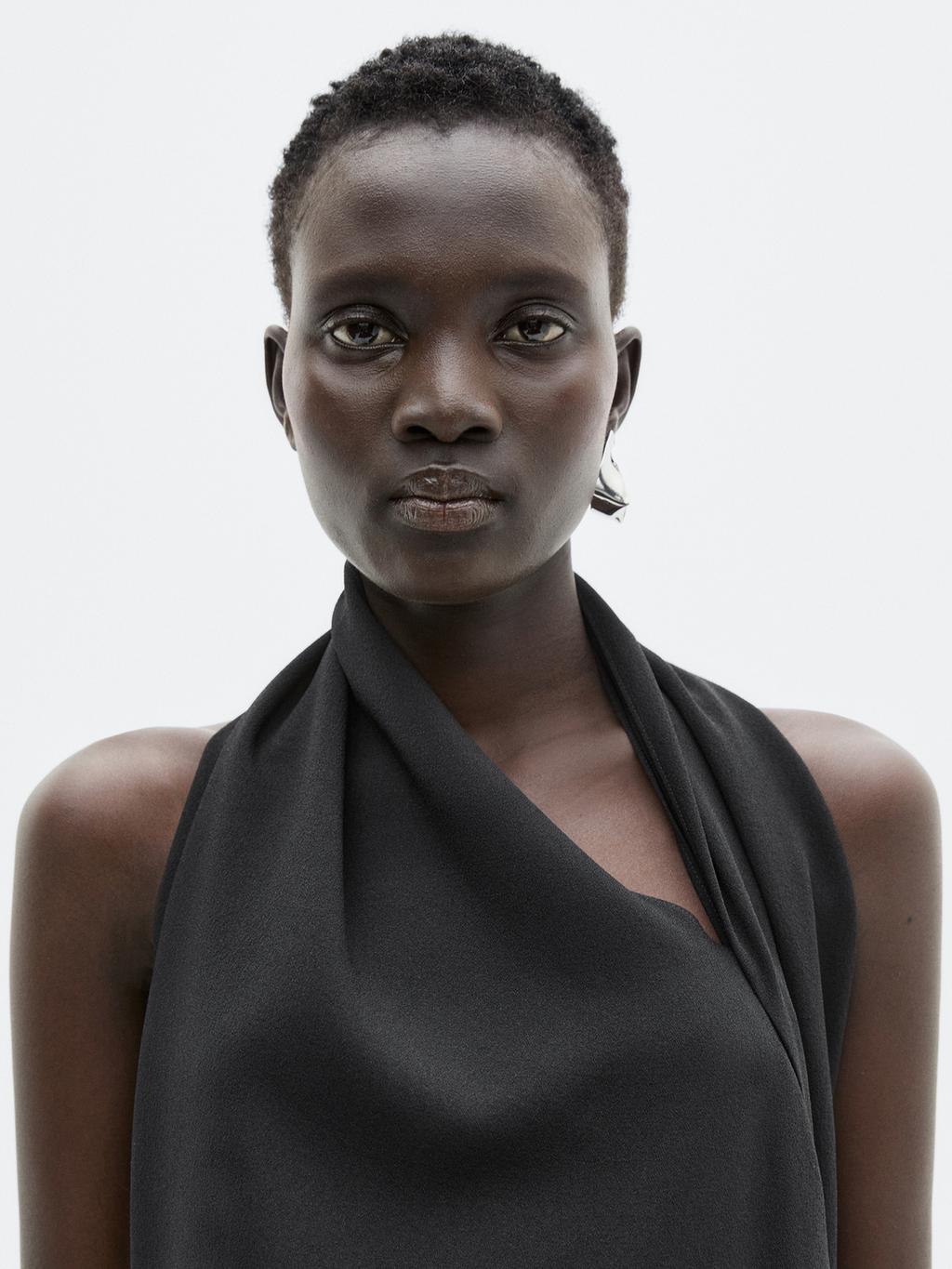 Long dress with halter neck . Draped detail. Side zip fastening. Open back detail. Subtly textured crepe fabric.
