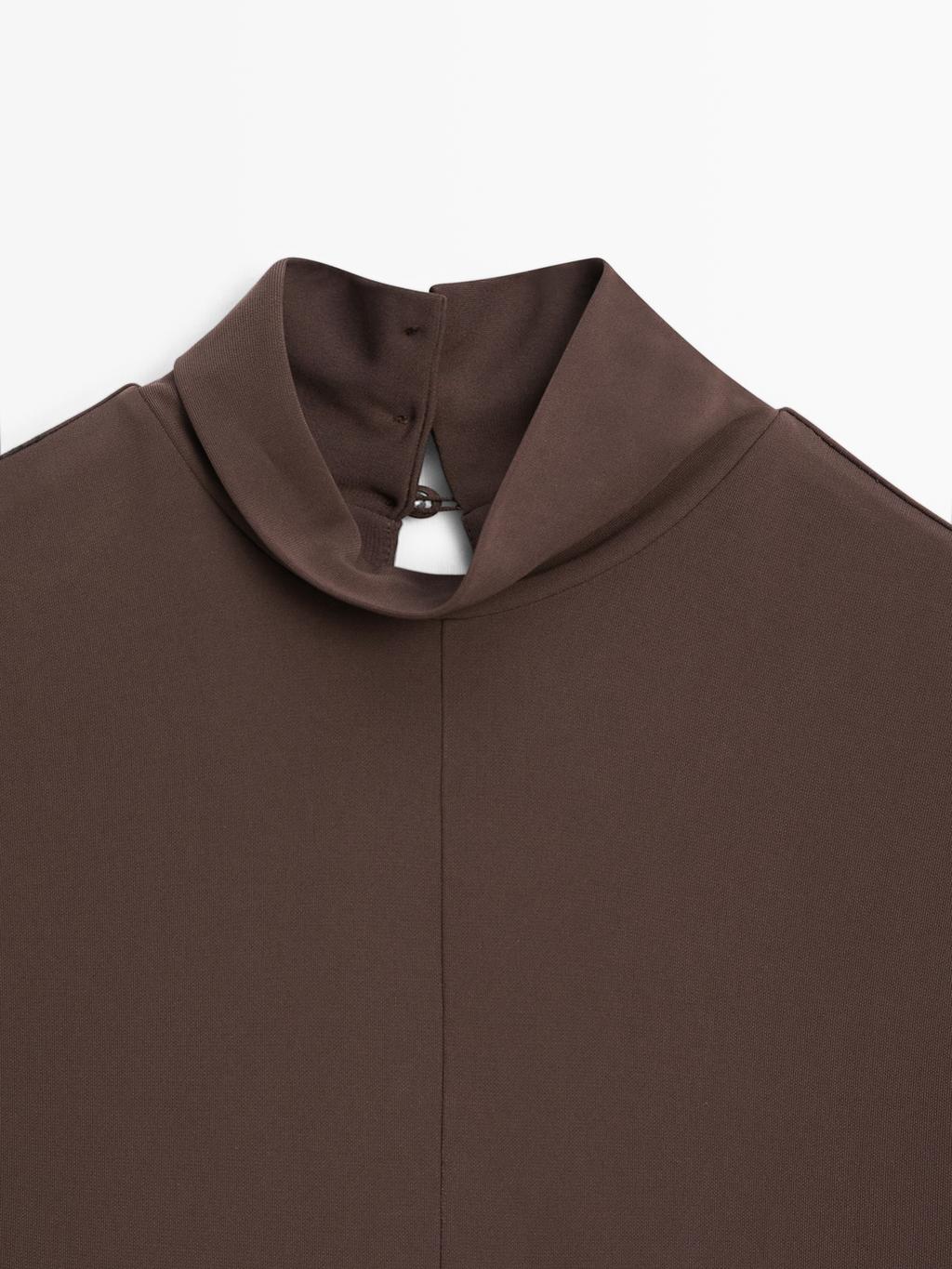 Long flared dress. Slightly fitted silhouette, providing a more defined and slim appearance. Sleeveless. Back button fastening and teardrop opening. High collar.