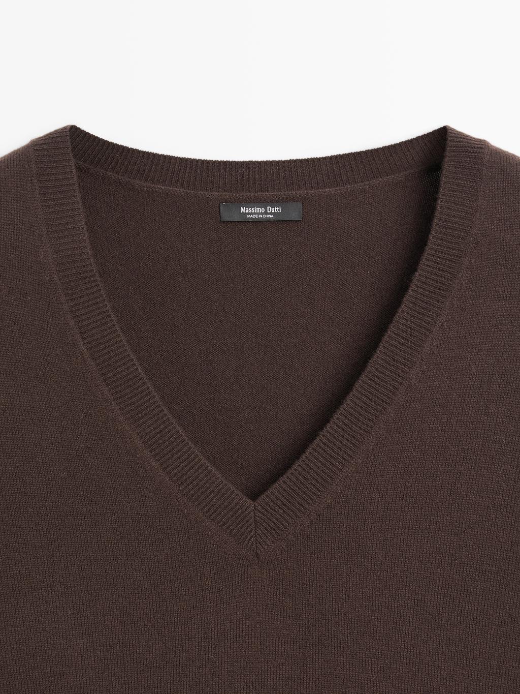 Knit sweater made of a wool blend fabric . V-neck. Long sleeves. Lace-finished hem . Side splits . Ribbed trims .
