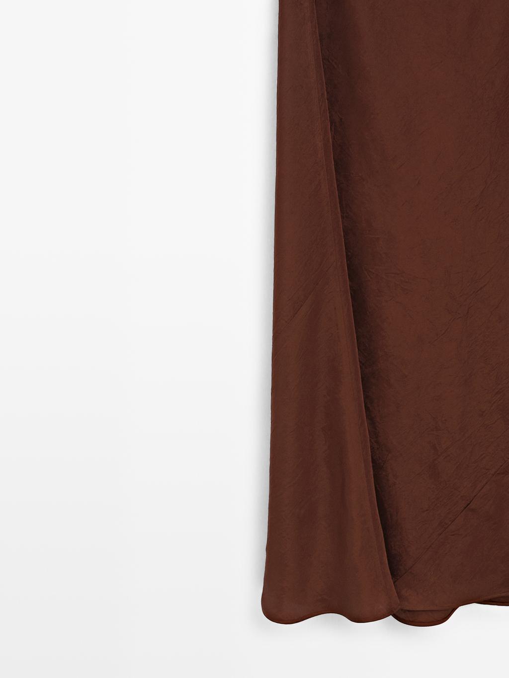 Long flowing dress with round neckline . Sleeveless. Satin finish. Draped detail. Open back detail.