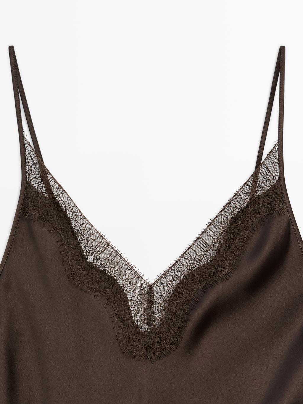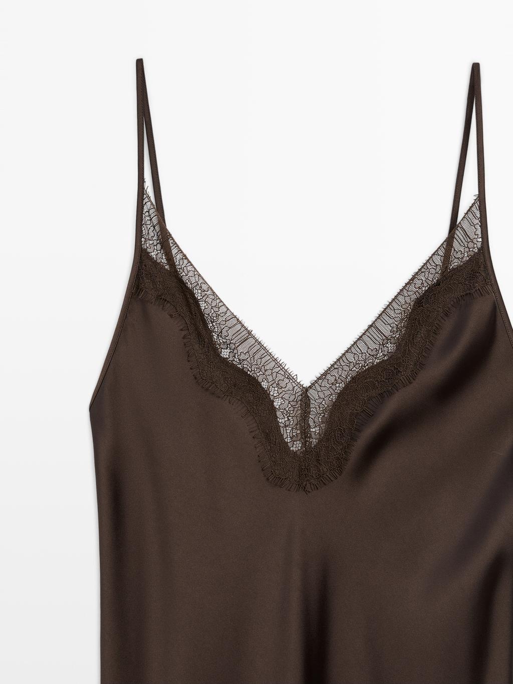 Long lace-trimmed dress. V-neck . Strappy. Satin finish. Blonde lace detail.