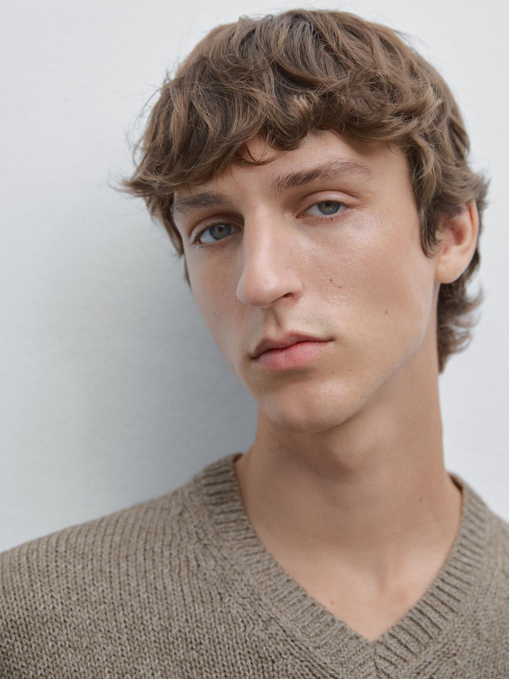 Knit sweater made of a cotton blend fabric. V-neck. Long sleeves. Melange fabric.