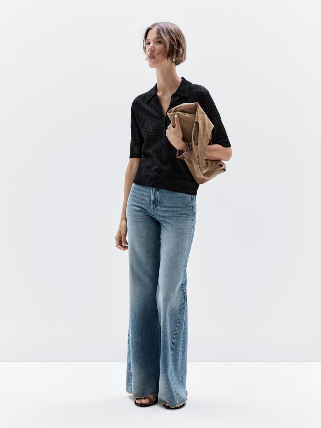 Wool blend knit sweater. Short sleeves. Polo collar with button fastening. Openwork fabric .