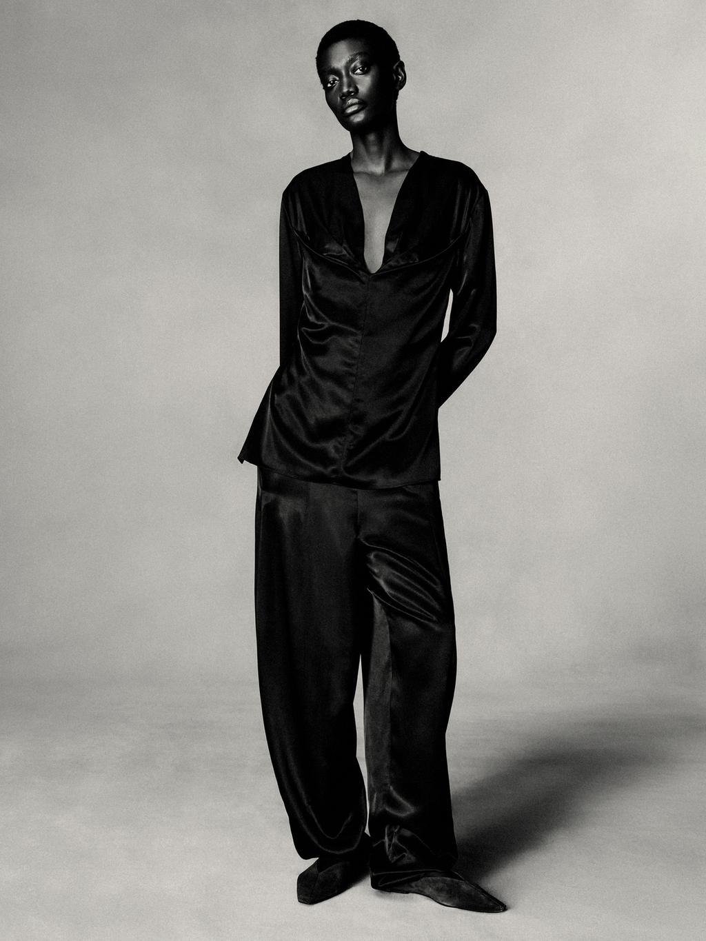 Blouse made of satin finish fabric with double draped effect neckline . V-neck. Long sleeves. Back button fastening and teardrop opening. Matching garment available.