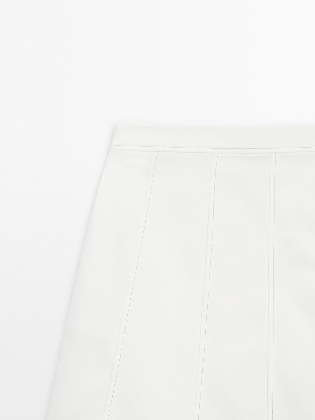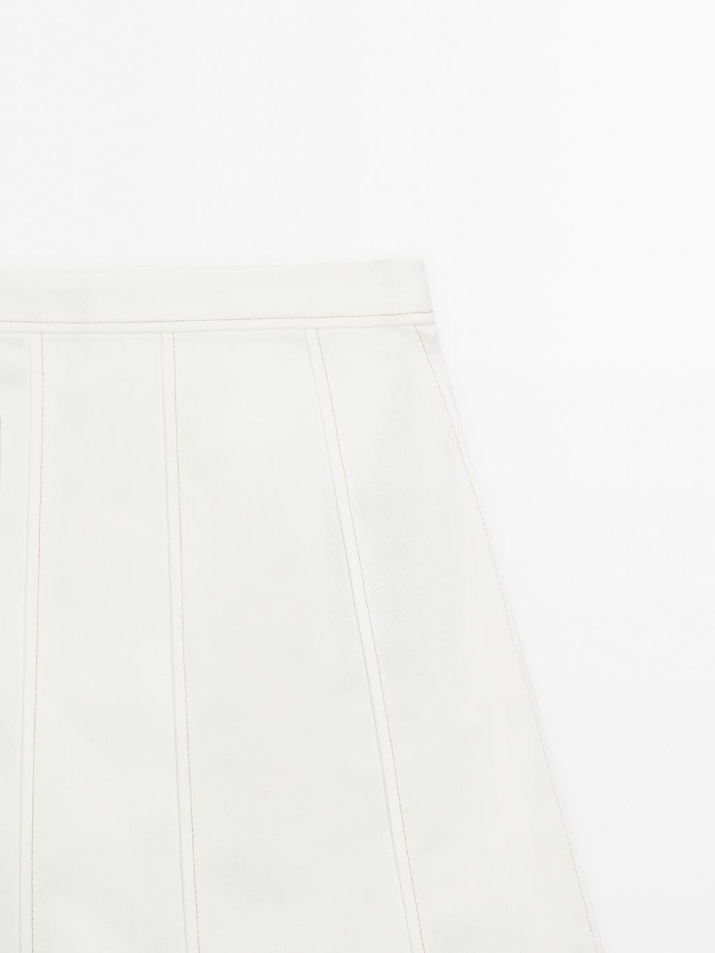 Short denim skirt made of 100% cotton fabric with stitched detailing. Side zip fastening. Two side pockets.