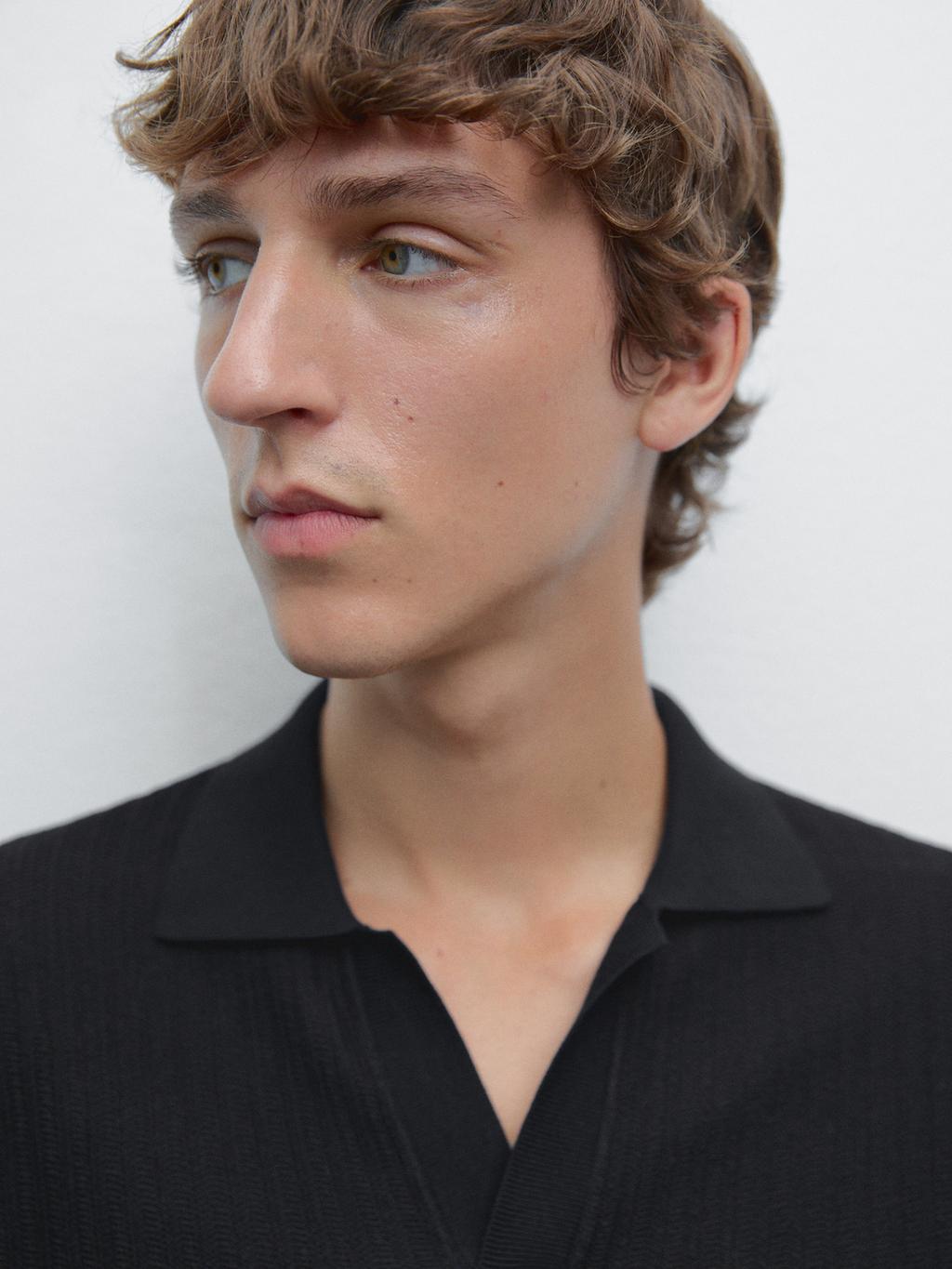 Polo shirt made of 100% cotton knit fabric. Wide and relaxed silhouette, not tailored. V-neck. Short sleeves. Jacquard fabric.
