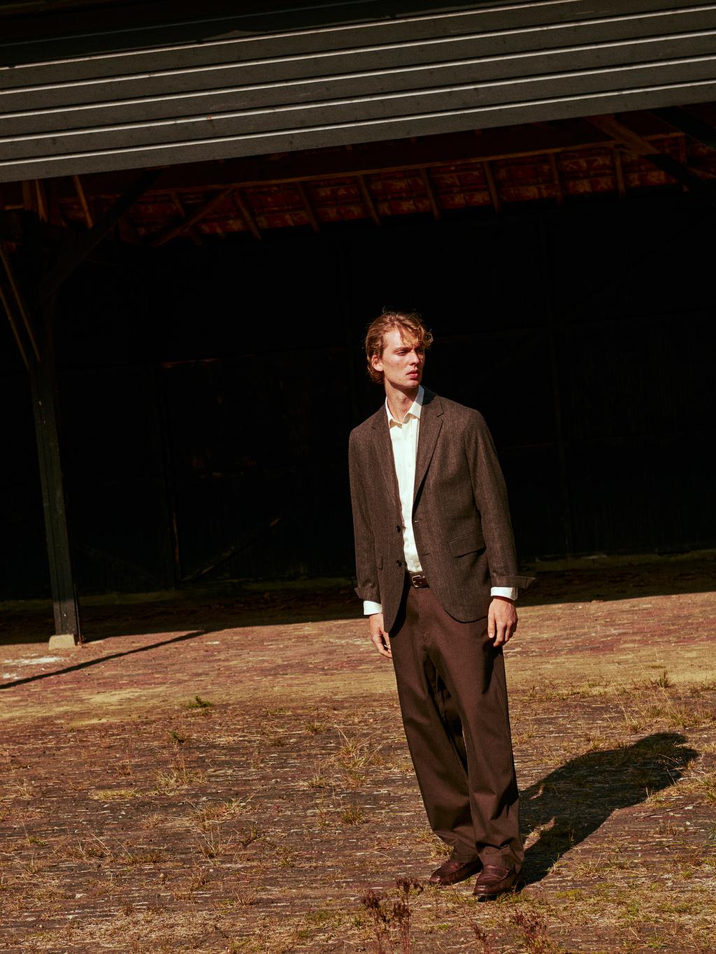 Wool blend blazer. Lapel collar. Long sleeves with buttoned cuffs. Two-button fastening. Striped detail. This garment is part of a suit.