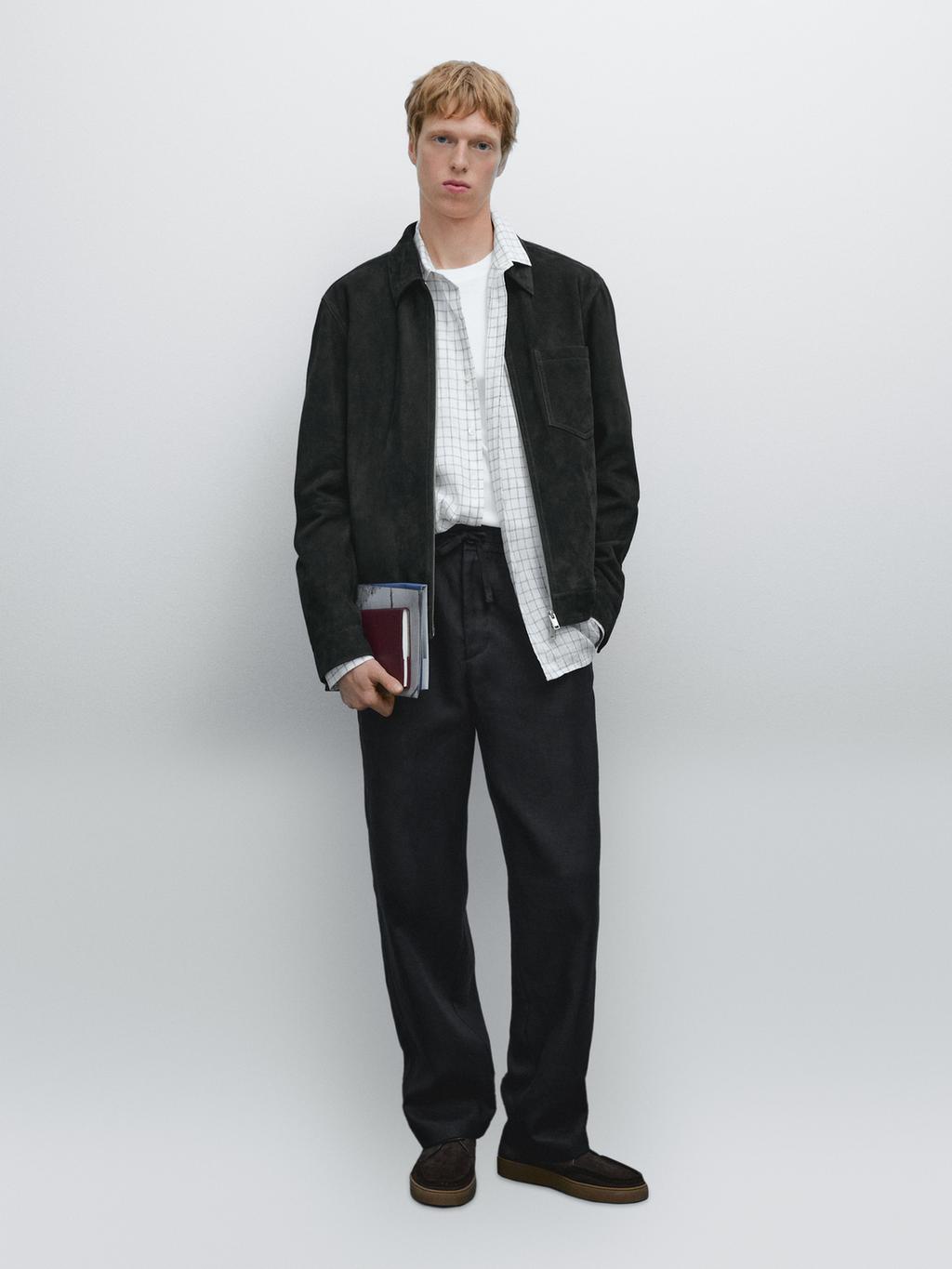 Jacket made of goatskin leather with a suede finish. Shirt collar. Long sleeves with snap button tab on the cuffs. It has a two-way zip fastening. Besom pocket at the chest. Side pockets with snap-button closure.