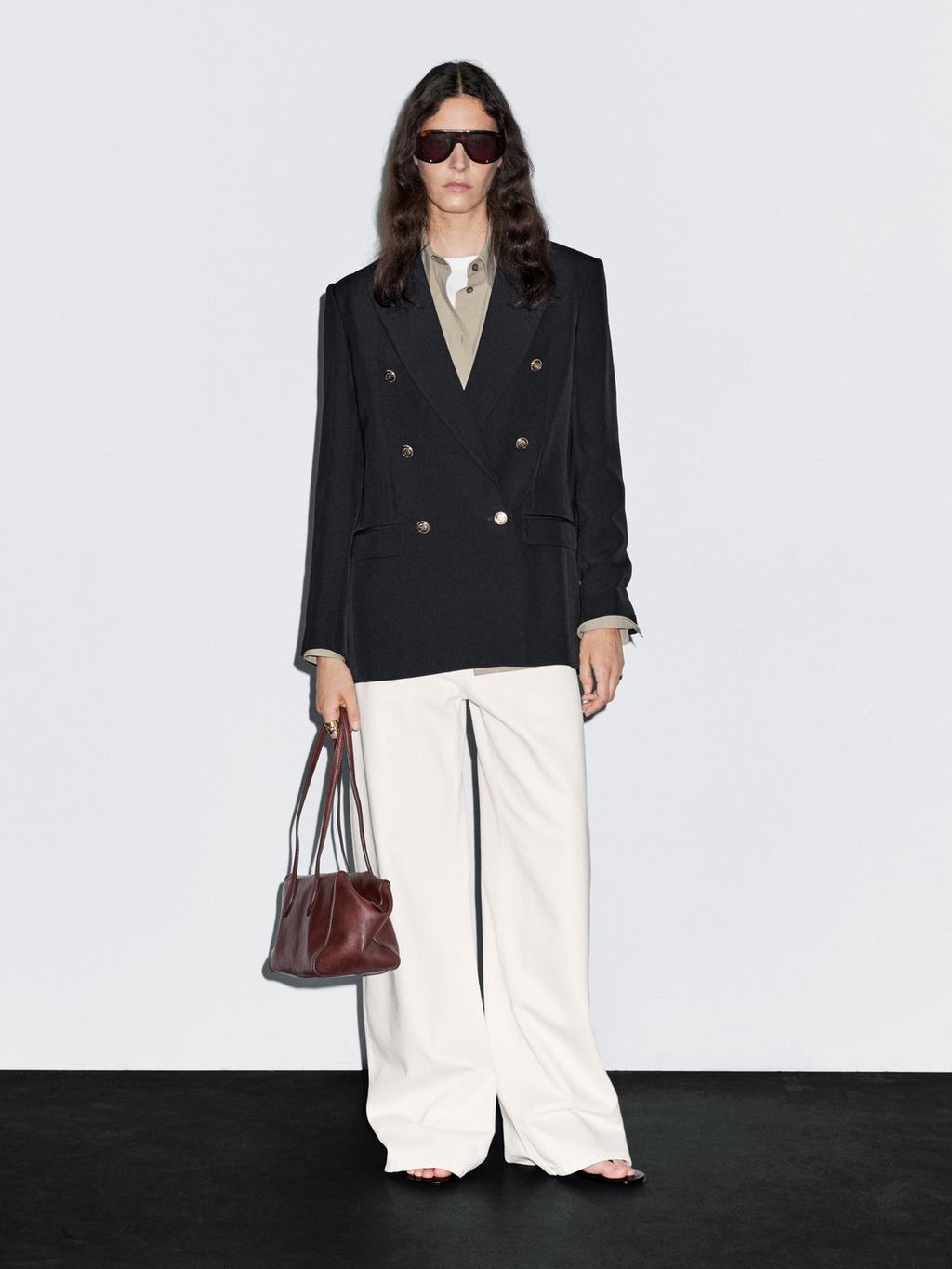 Wool blend blazer. Long sleeves. Double-breasted button fastening at the front. Elegant gold-toned rhinestone buttons. Two flap pockets. Lined.
