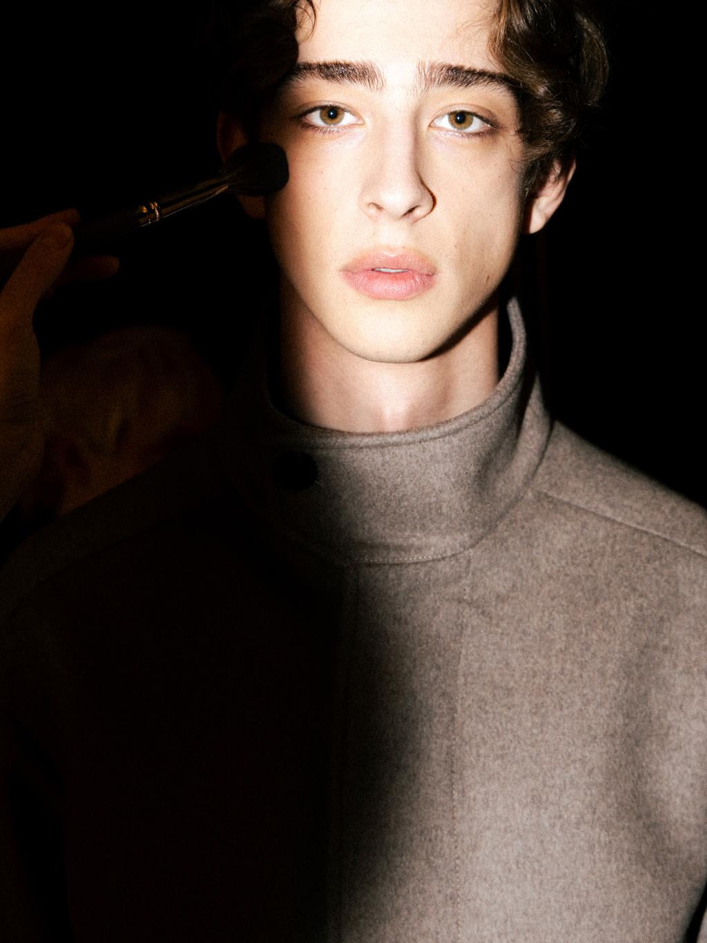 Long sleeves with buttoned cuffs. Front button fastening concealed by a placket. Buttoned-up high neck. Two side pockets. Inside pockets. Buttoned strap at the hem.